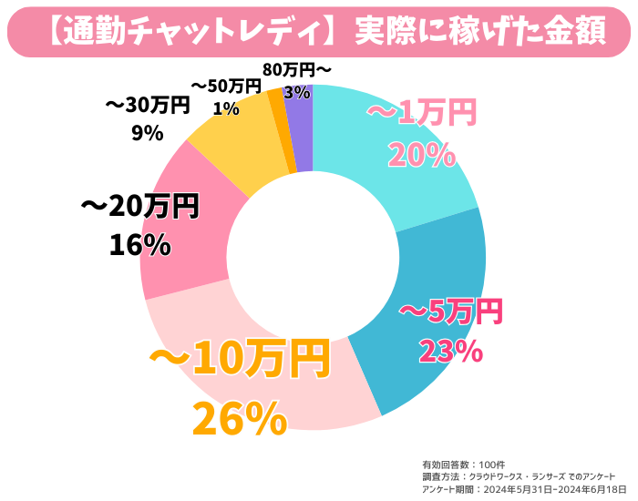 アンケートデータを踏まえ、ポケットワークで通勤チャットレディとして活動している人は、10万円ほど稼いでいる人が一番多いことがわかります!その人たちは月間およそ30時間稼働しており、時給に換算すると以下の通りです。